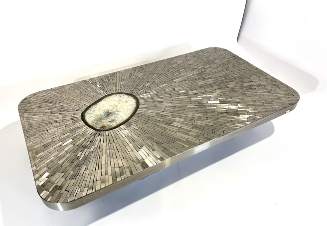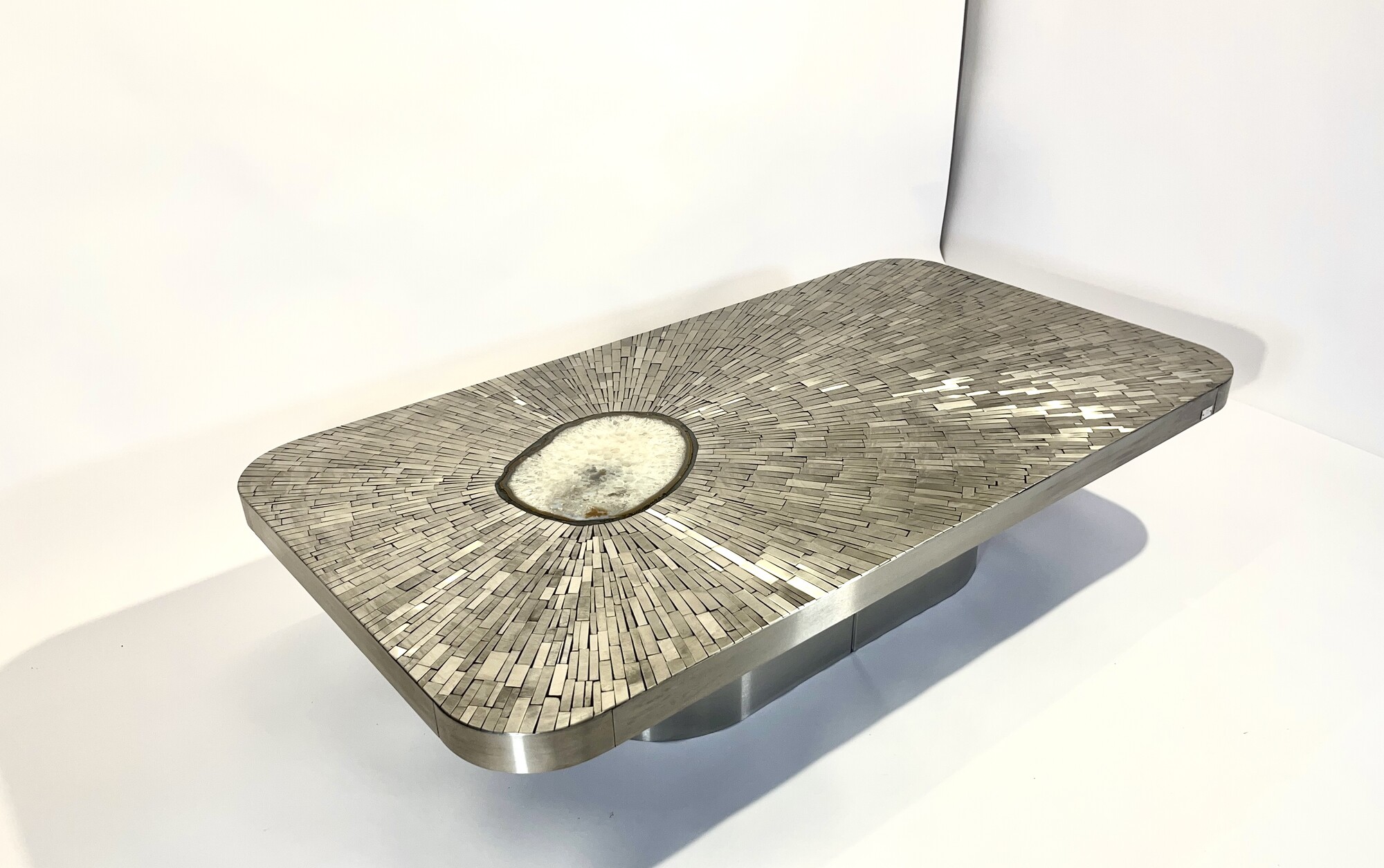 Created to measure by Stan Usel, this coffee table of stainless steel, table topped with a magnificent mosaic stainless steel agate gemstone highlighting a mosaic radiation. Each piece is topped with a unique stone and when put together aside gives a great sense of harmony. Exceptional craftsmanship with the art of tailor made furniture. This original and unique pieces are signed by the artist and comes with the certificate of authenticity.All pieces can be custom-made to order. Proudly Belgian.