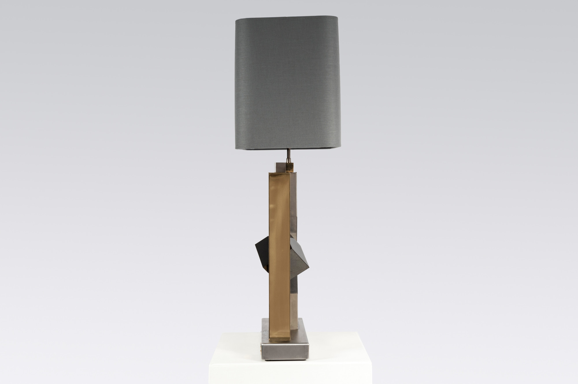 Created to measure by Stan Usel, this pair detail of Black marble cube,stainless steel and brass table lamps. Each piece is inlay with a unique stone and when put together aside gives a great sense of harmony. Exceptional craftsmanship with the art of tailor made furniture. This original and unique pieces are signed by the artist and comes with the certificate of authenticity.All pieces can be custom-made to order. Proudly Belgian.