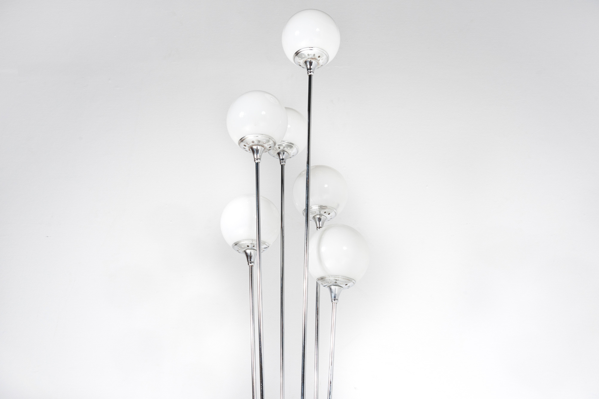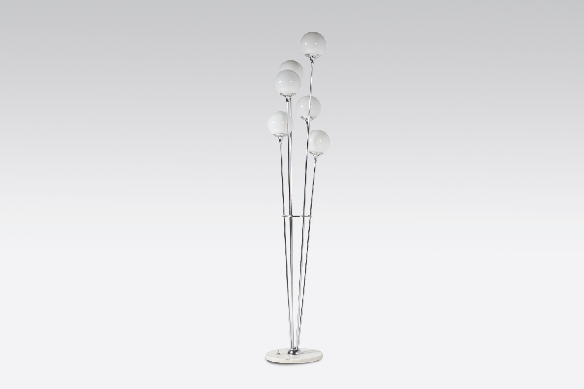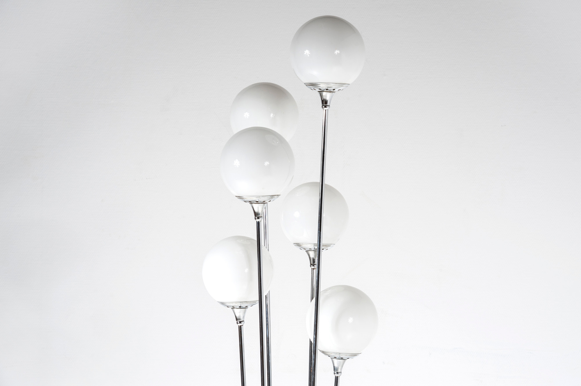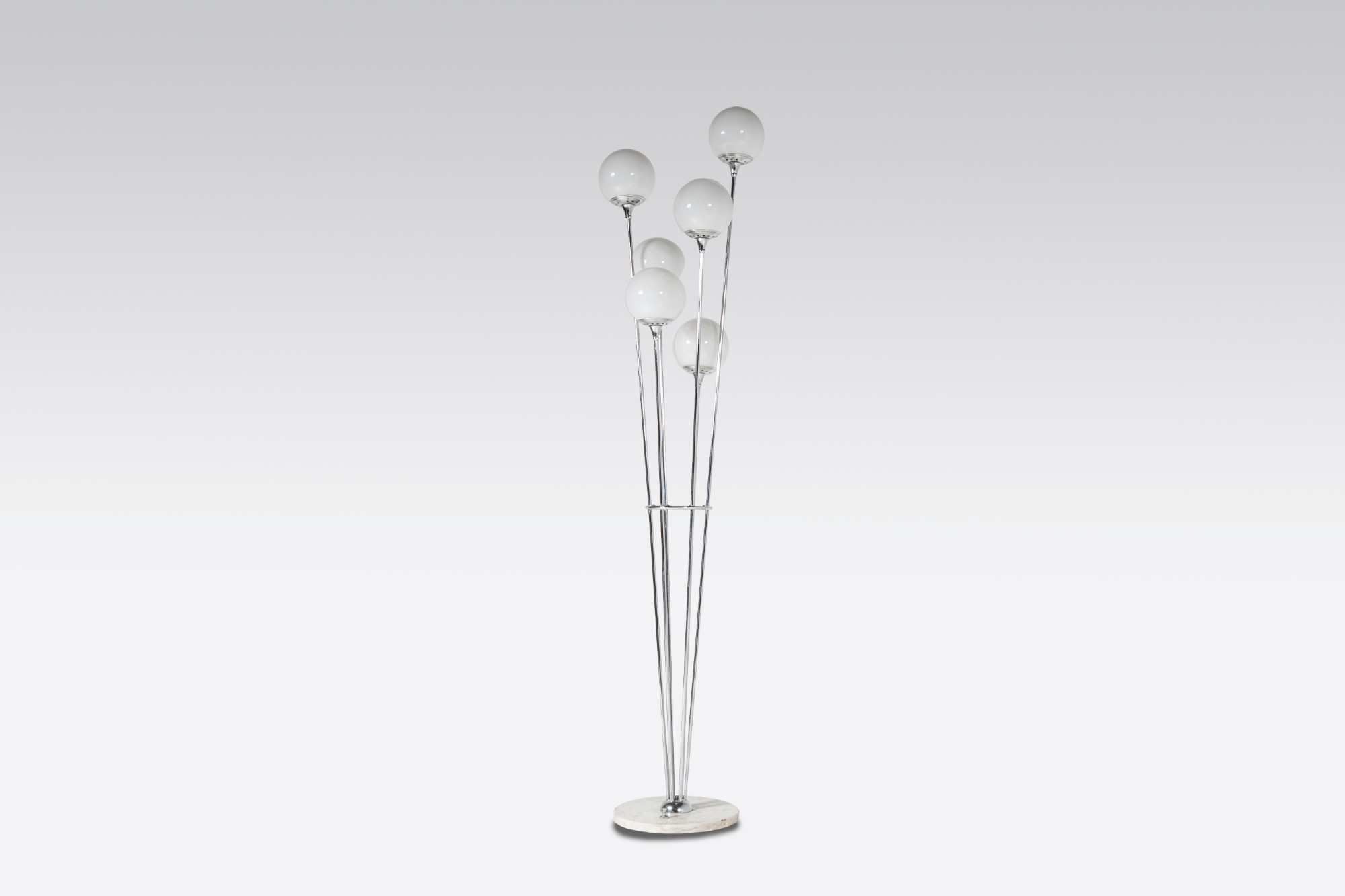 Alberello floor lamp by Stilnovo. White Marble feet with long chrome stems finished with white glass globes. lights up with three different positions. Original conditions, little shot on the marble base. Italy Circa 1960.