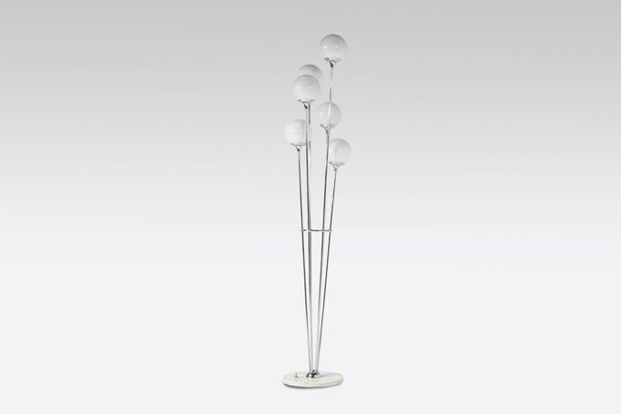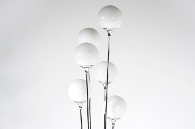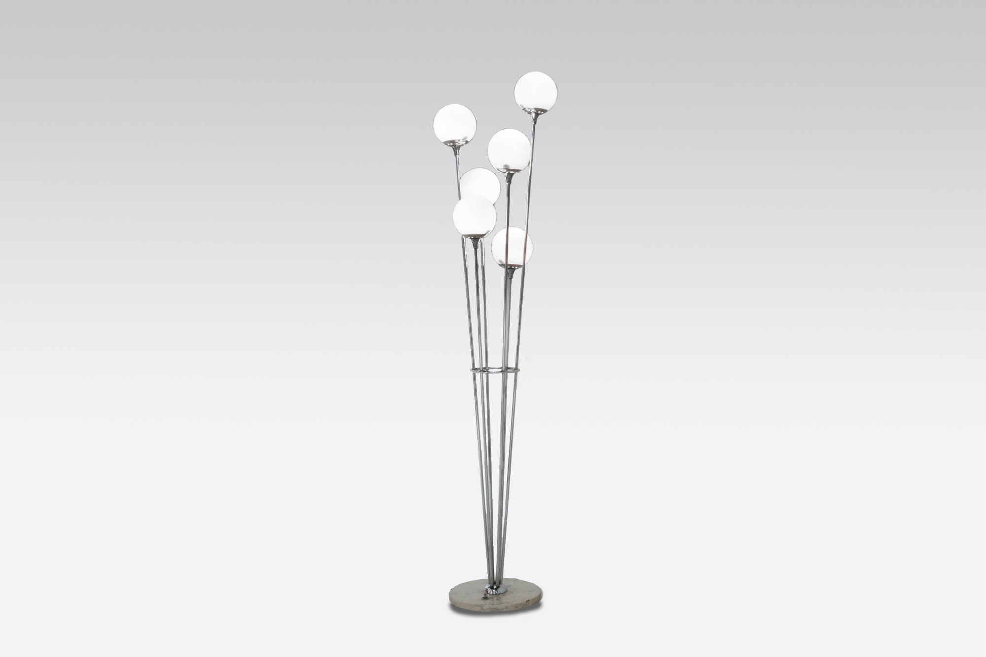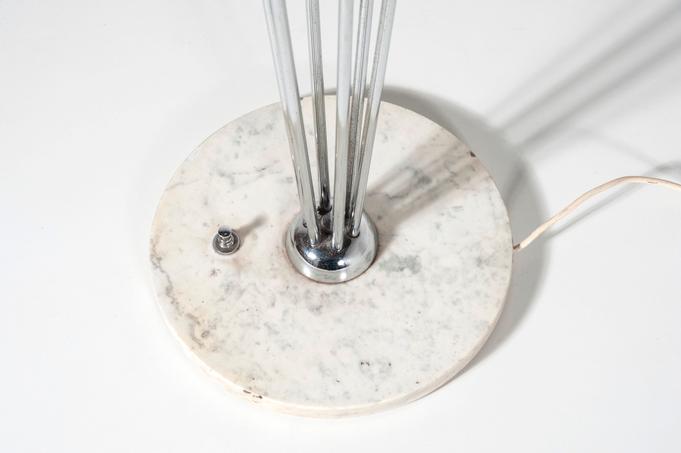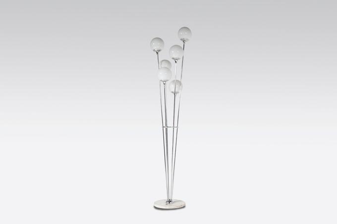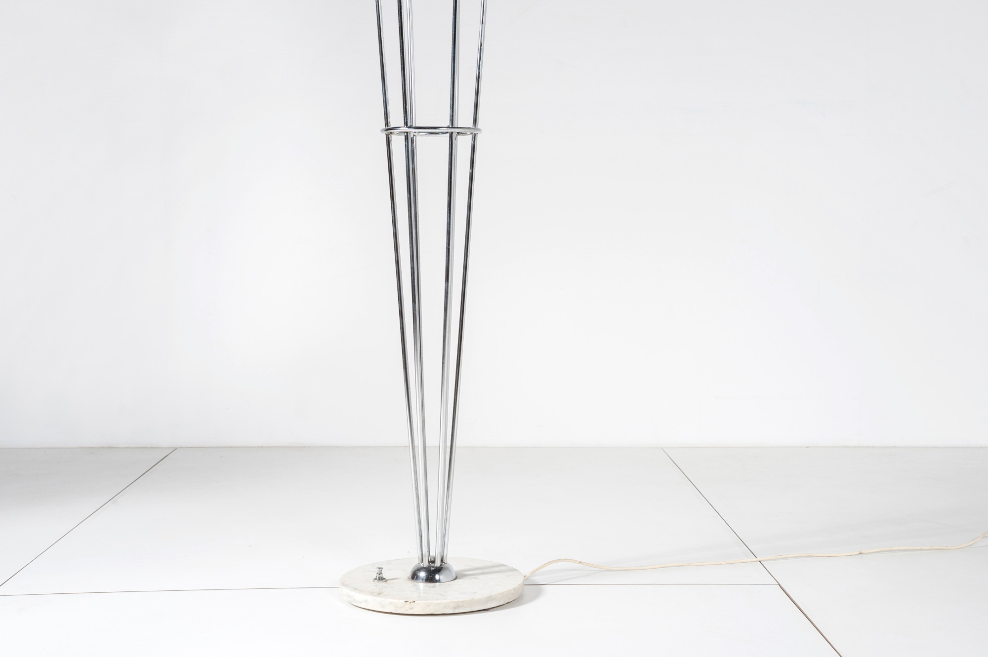 Alberello floor lamp by Stilnovo. White Marble feet with long chrome stems finished with white glass globes. lights up with three different positions. Original conditions, little shot on the marble base. Italy Circa 1960.