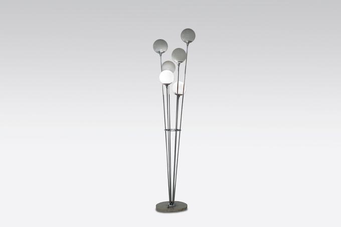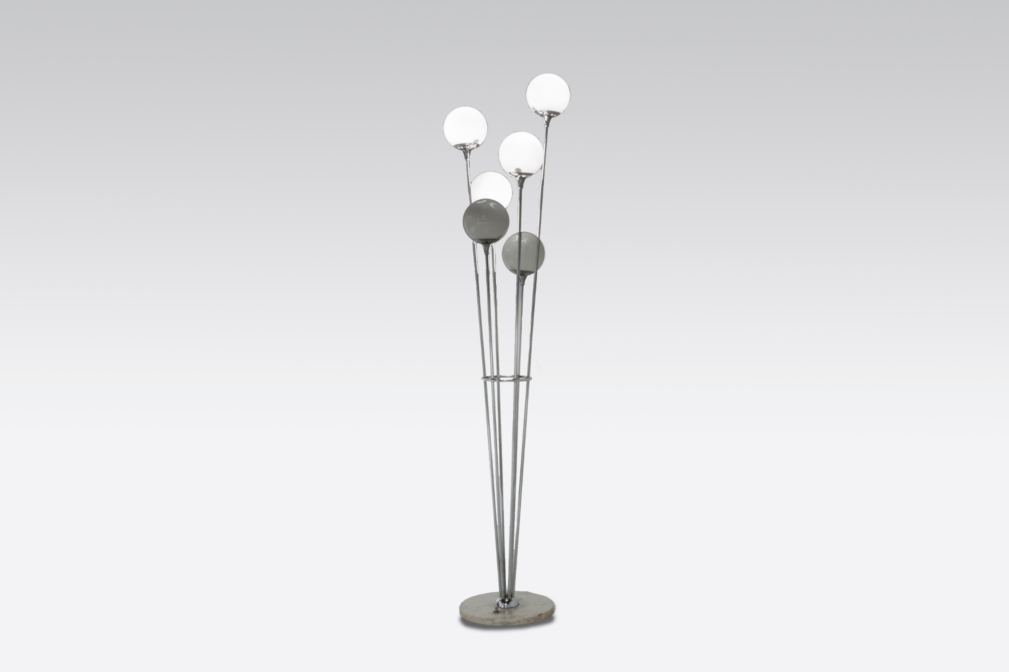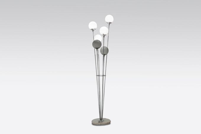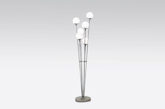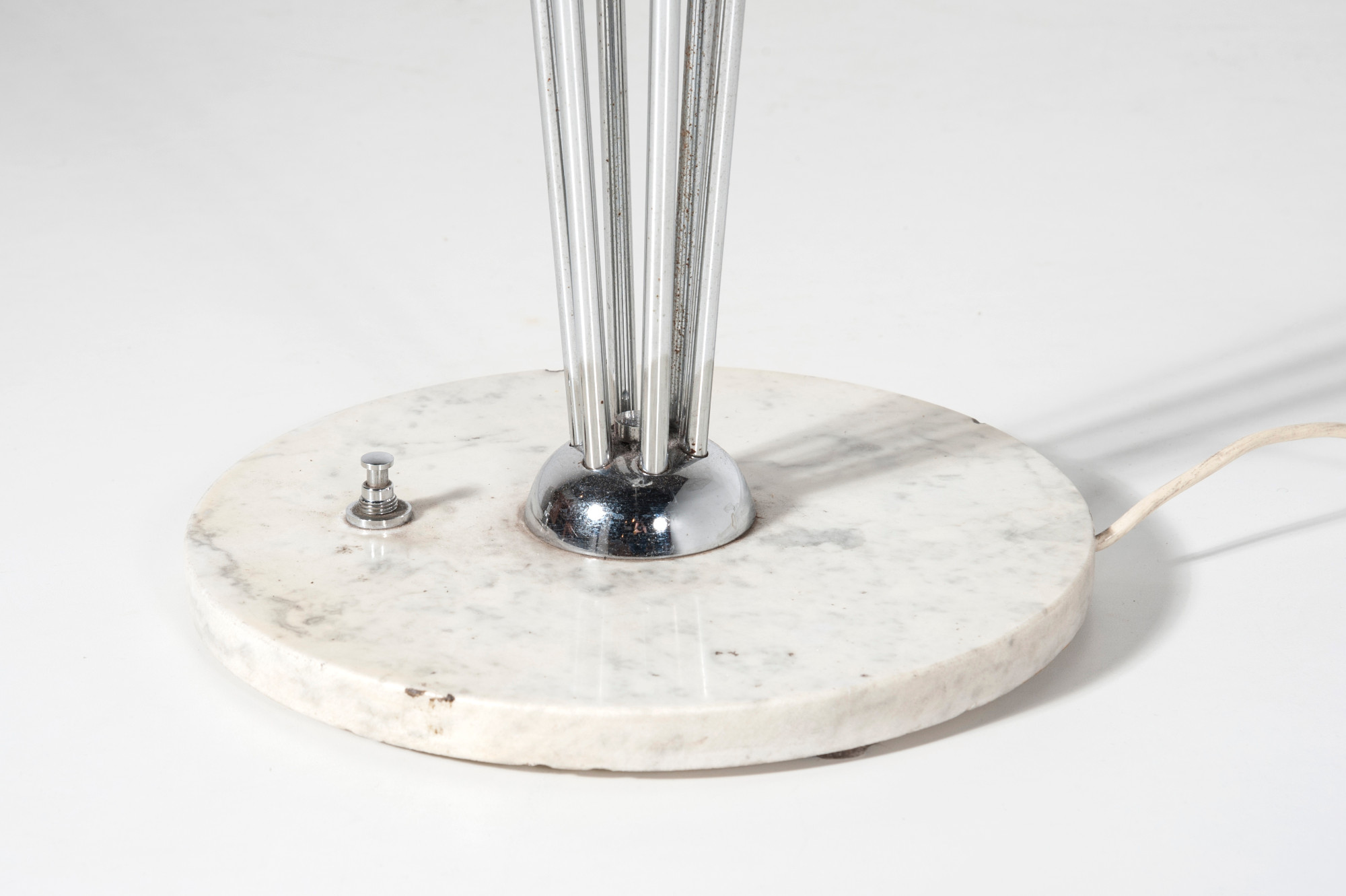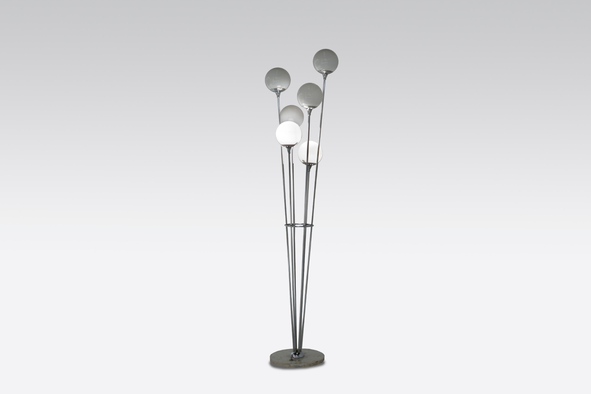 Alberello floor lamp by Stilnovo. White Marble feet with long chrome stems finished with white glass globes. lights up with three different positions. Original conditions, little shot on the marble base. Italy Circa 1960.