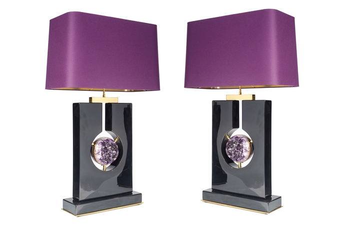 Pair Of Table Lamps in Black Resin crimped Ametist Sphere By Stan Usel