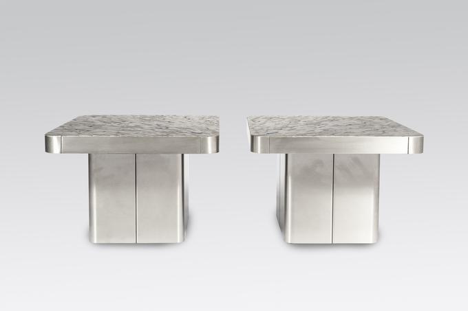 Created to measure by Stan Usel, this pair of side table in mosaic stainless steel and la pis lasuli gemstone. Do not hesitate to ask us the different models, already executed. Form Exceptional craftsmanship with the art of tailor made furniture. This original and unique pieces are signed by the artist and comes with the certificate of authenticity.All pieces can be custom-made to order. Proudly Belgian.