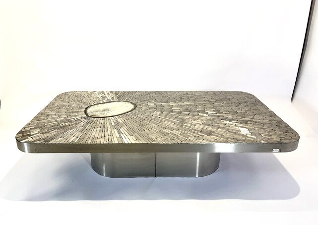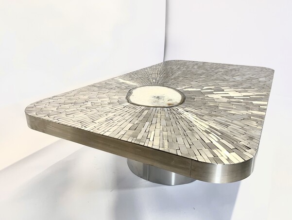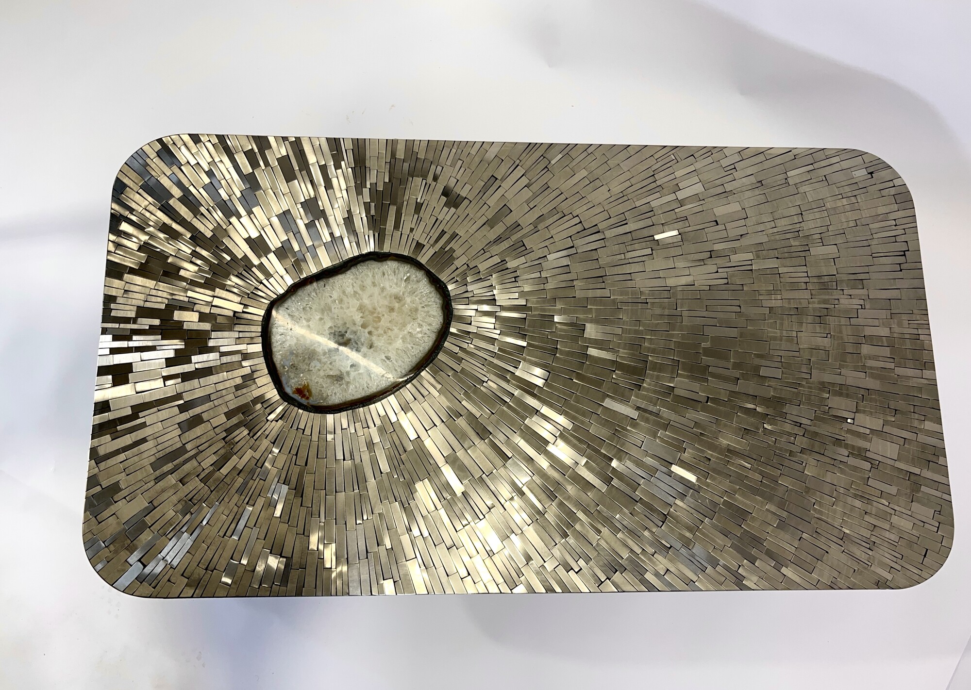 Created to measure by Stan Usel, this coffee table of stainless steel, table topped with a magnificent mosaic stainless steel agate gemstone highlighting a mosaic radiation. Each piece is topped with a unique stone and when put together aside gives a great sense of harmony. Exceptional craftsmanship with the art of tailor made furniture. This original and unique pieces are signed by the artist and comes with the certificate of authenticity.All pieces can be custom-made to order. Proudly Belgian.