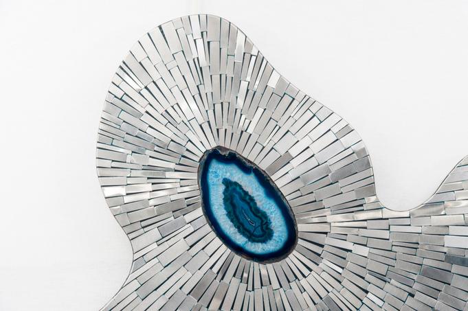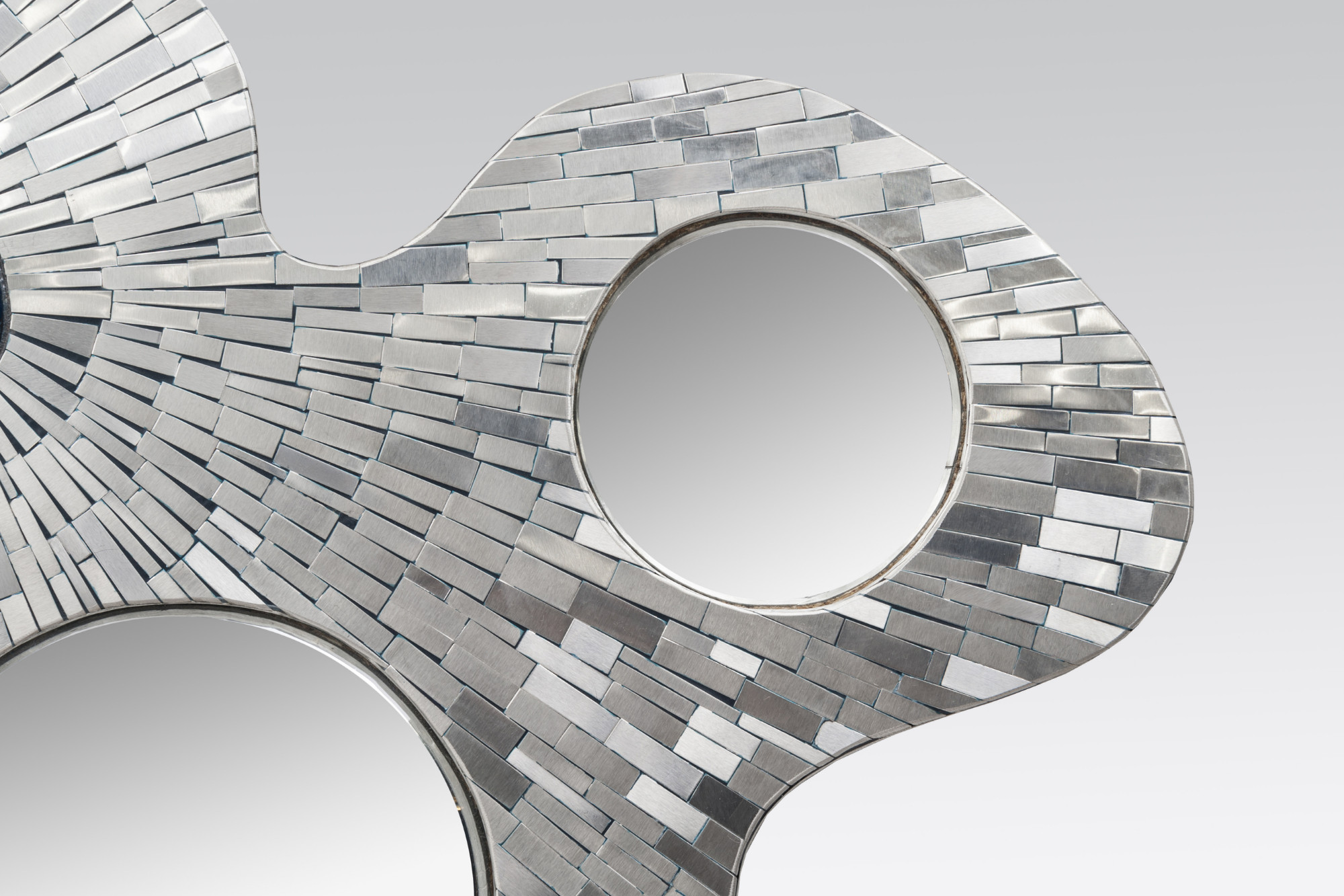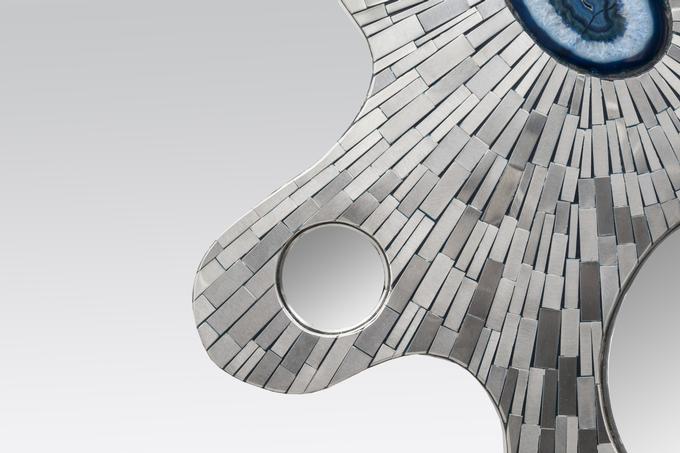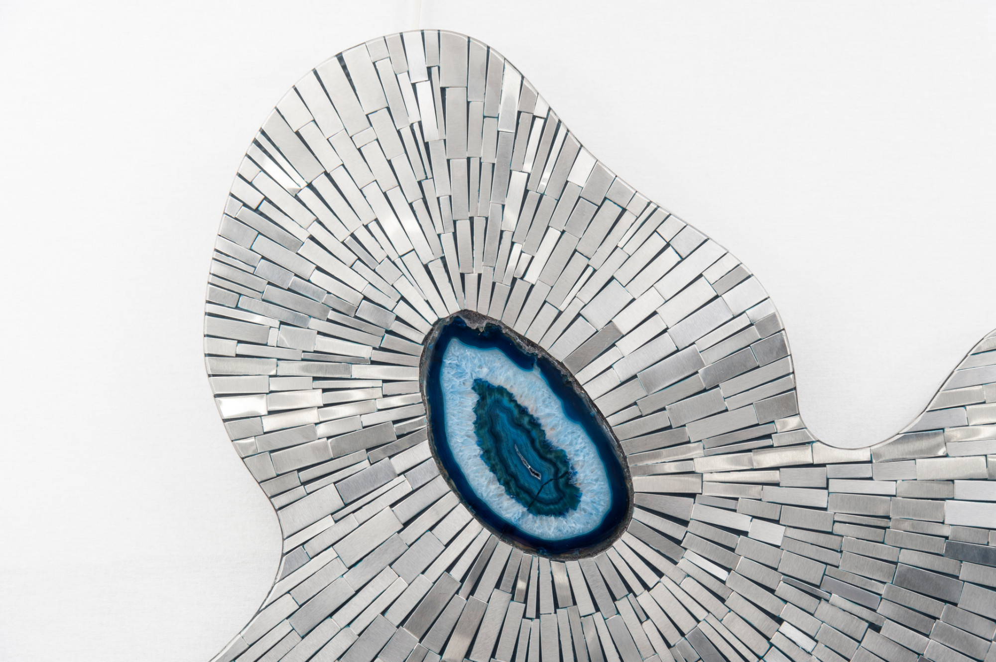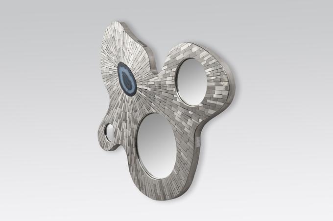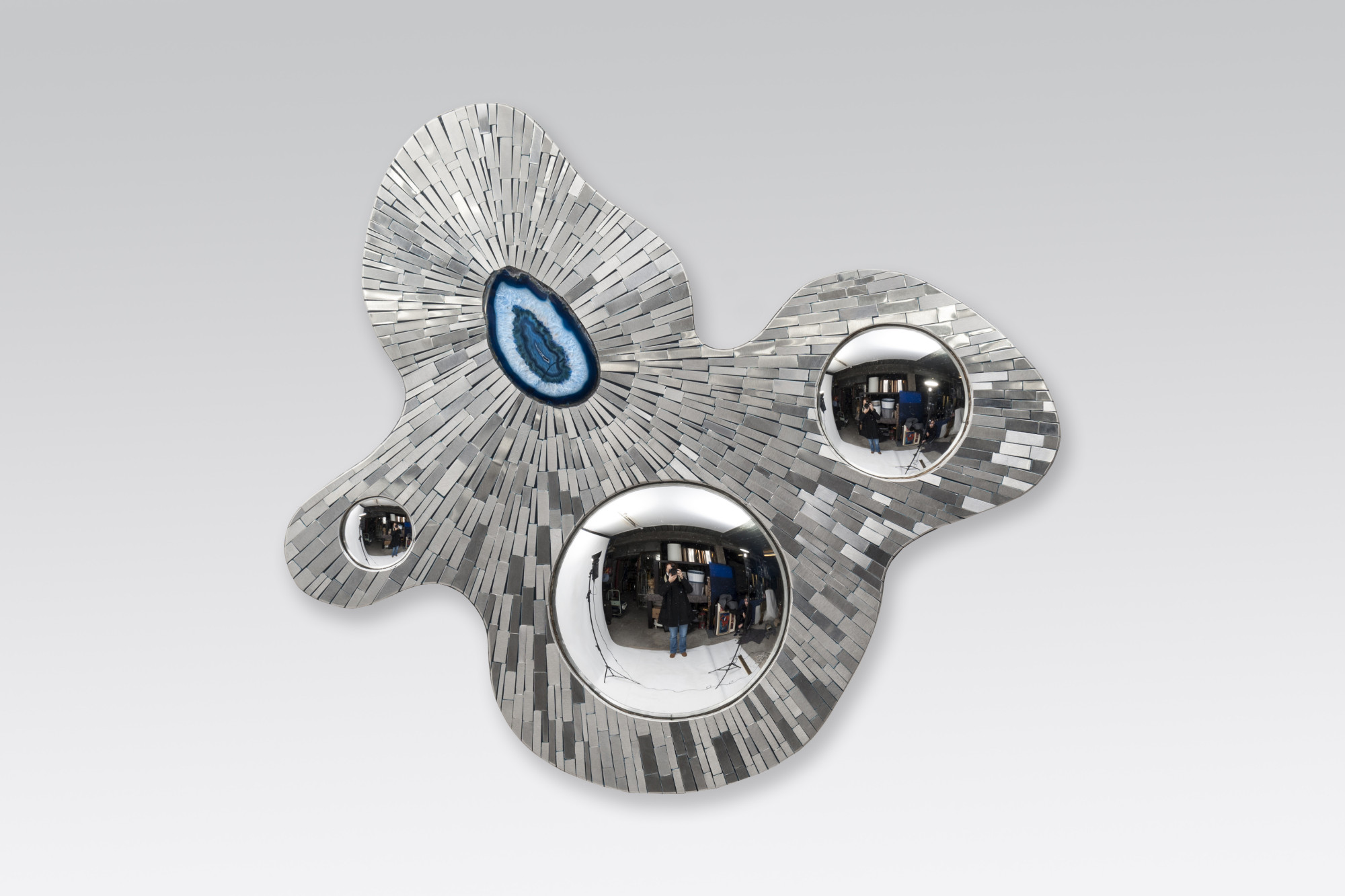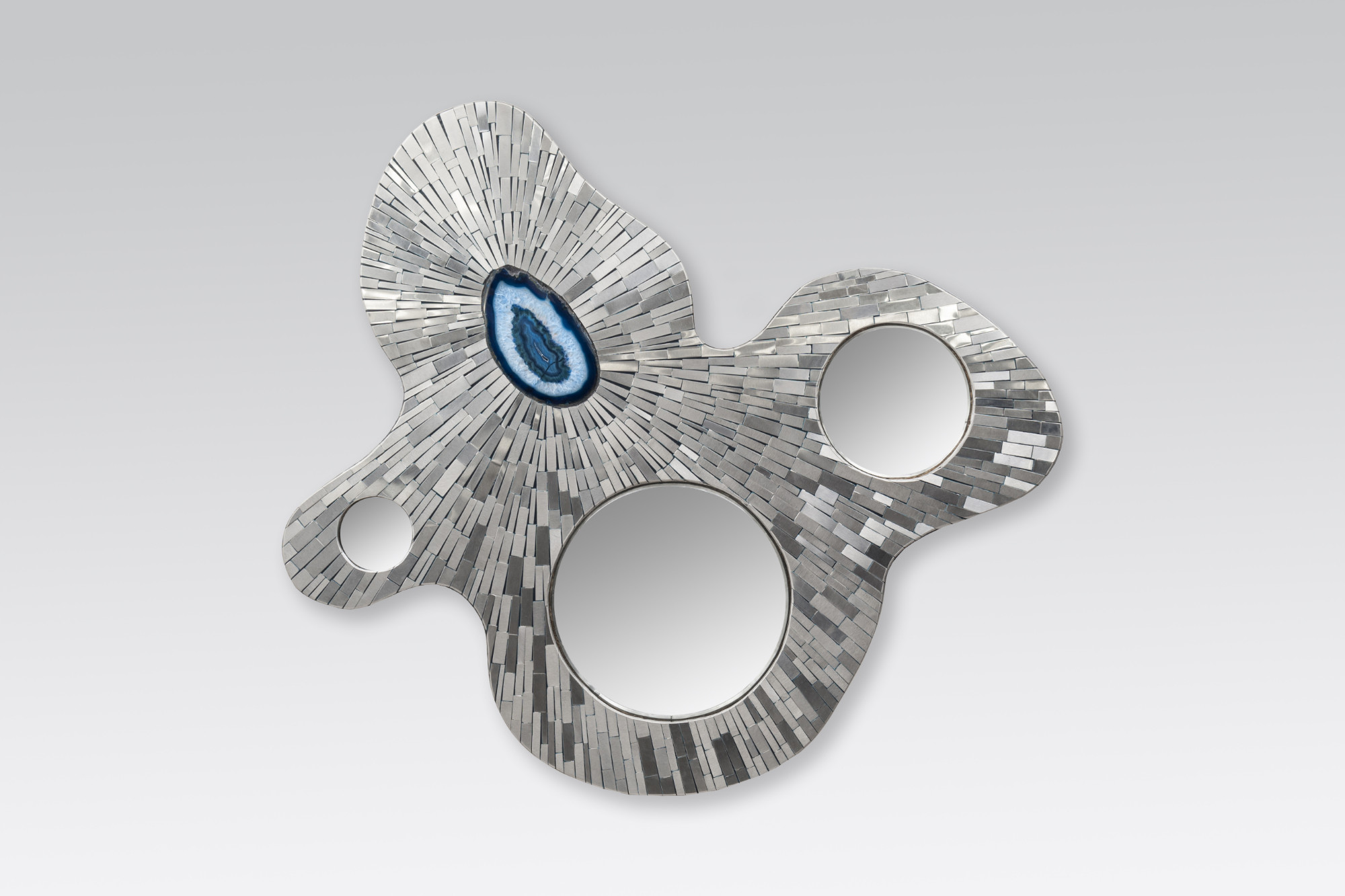 Created to measure by Stan Usel, this mirror in mosaic stainless steel, 3 convex glasses and agate gemstone. Do not hesitate to ask us the different models, already executed. Form Exceptional craftsmanship with the art of tailor made furniture. This original and unique pieces are signed by the artist and comes with the certificate of authenticity.All pieces can be custom-made to order. Proudly Belgian.