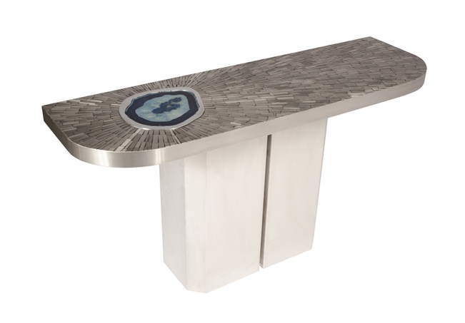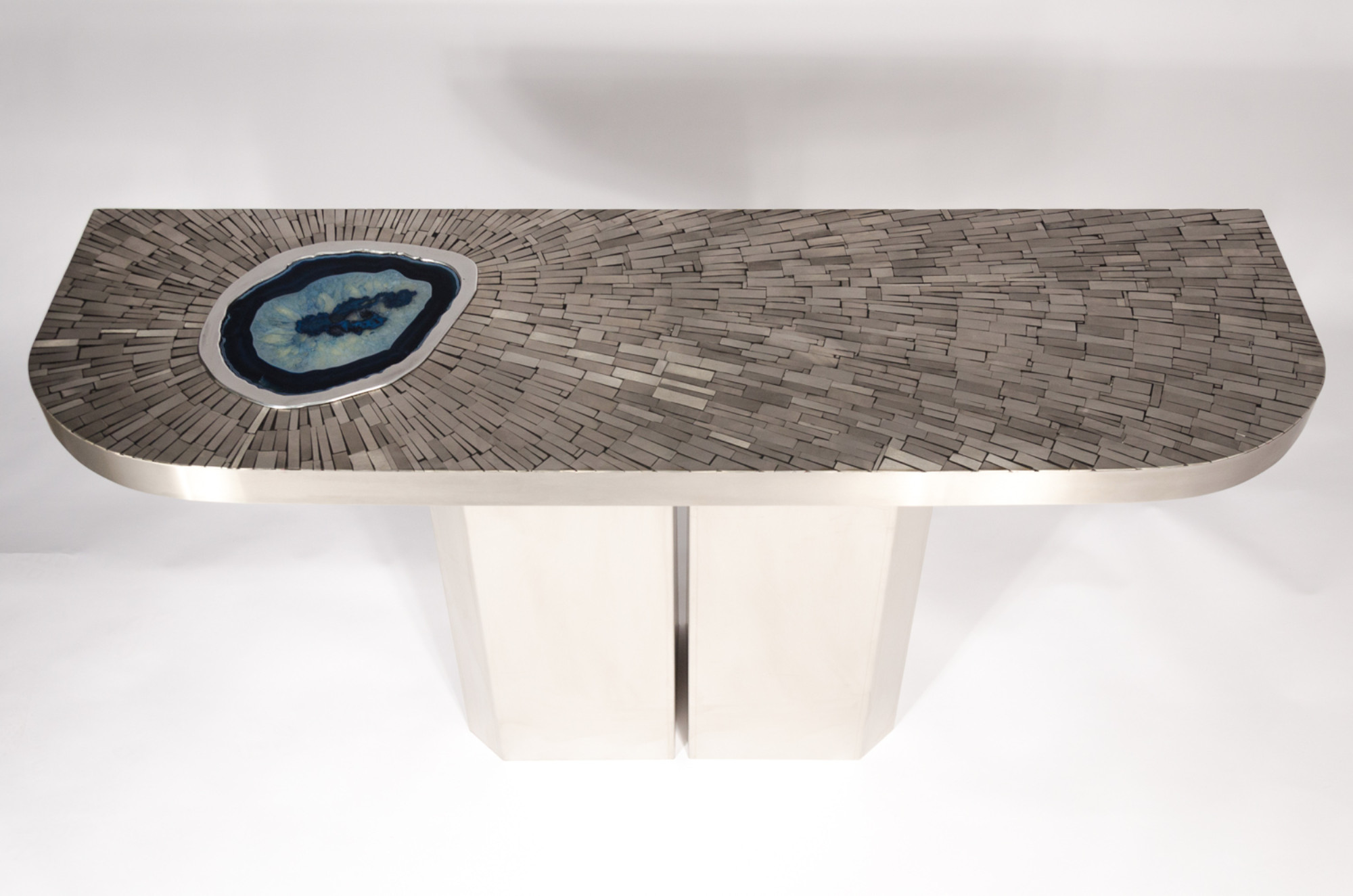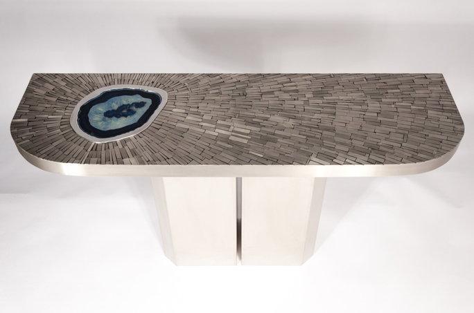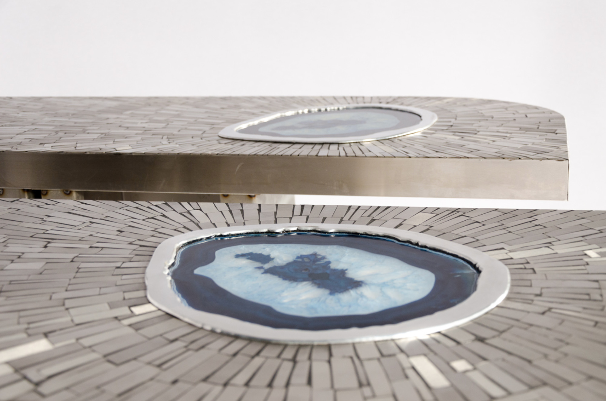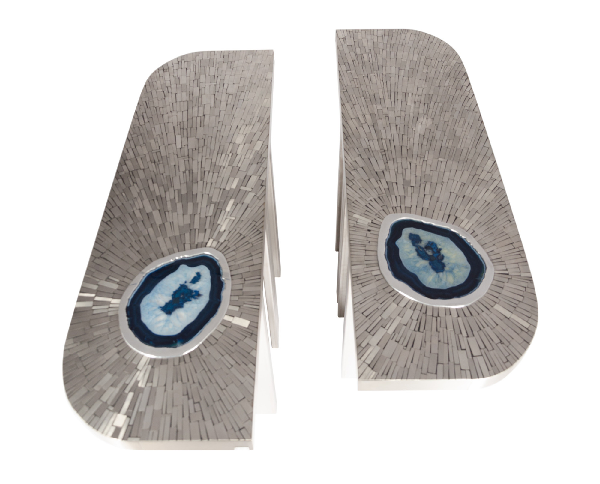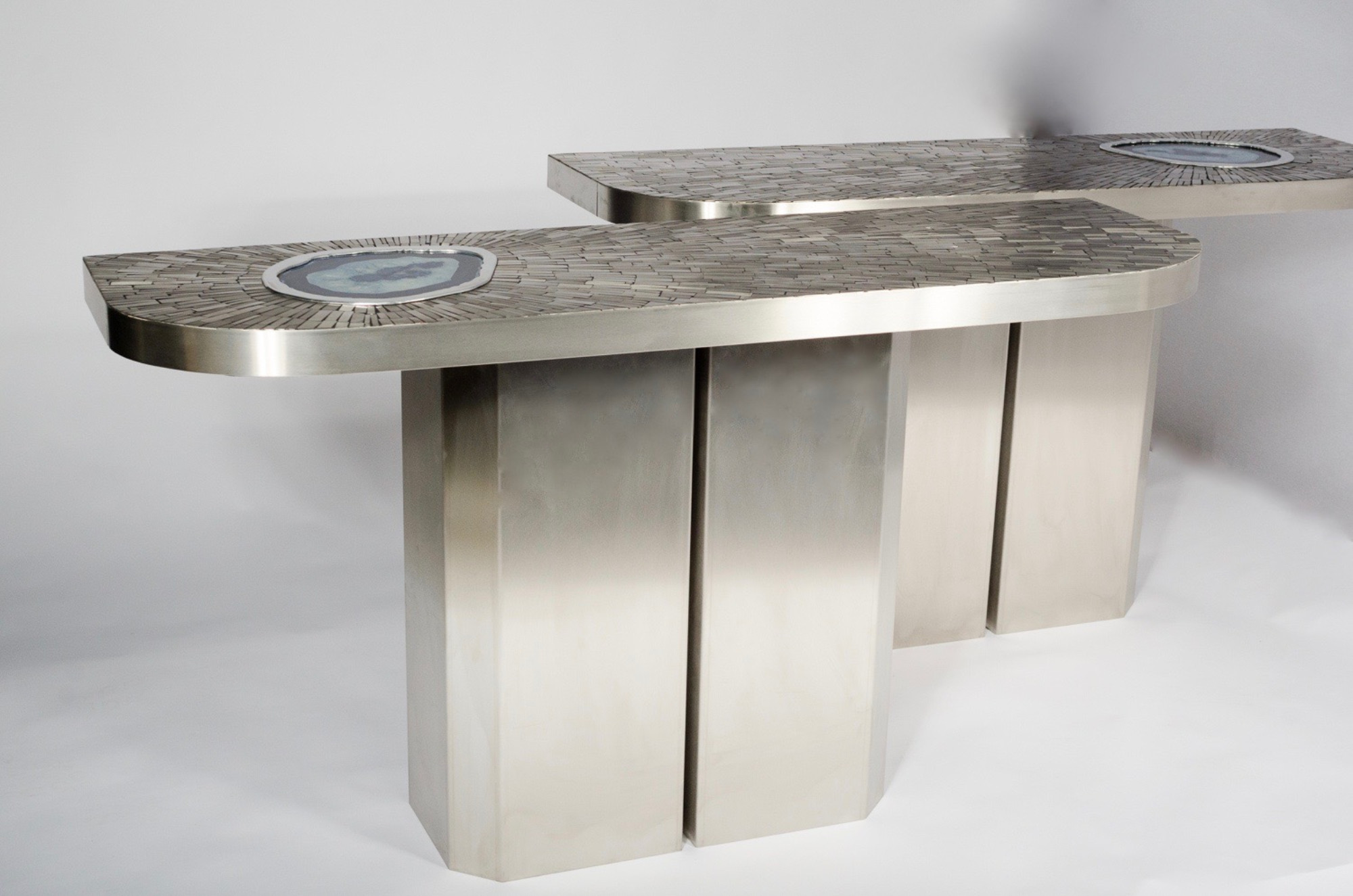 Created to measure by Stan Usel, this pair detail of stainless steel console table topped with a magnificent blue agate stone highlighting a mosaic radiation. Each piece is topped with a unique agate stone and when put together aside gives a vibrant sense of deepness. Exceptional craftsmanship with the art of tailor made furniture. Signed by the artist and comes with the certificat of authenticity.All pieces can be custom-made to order. Proudly Belgian.