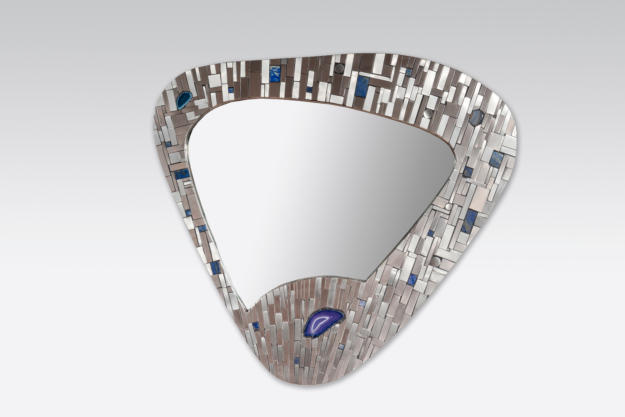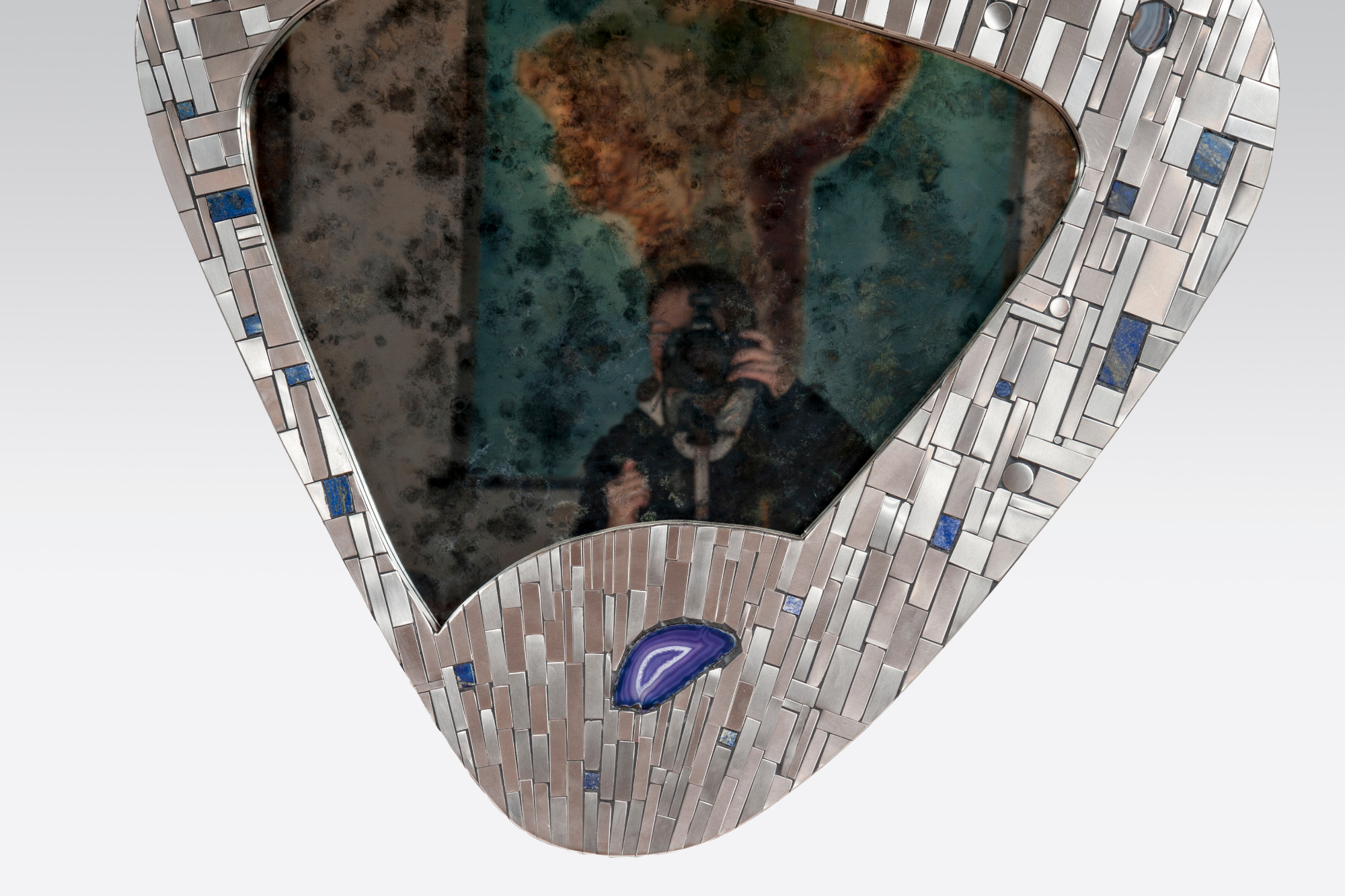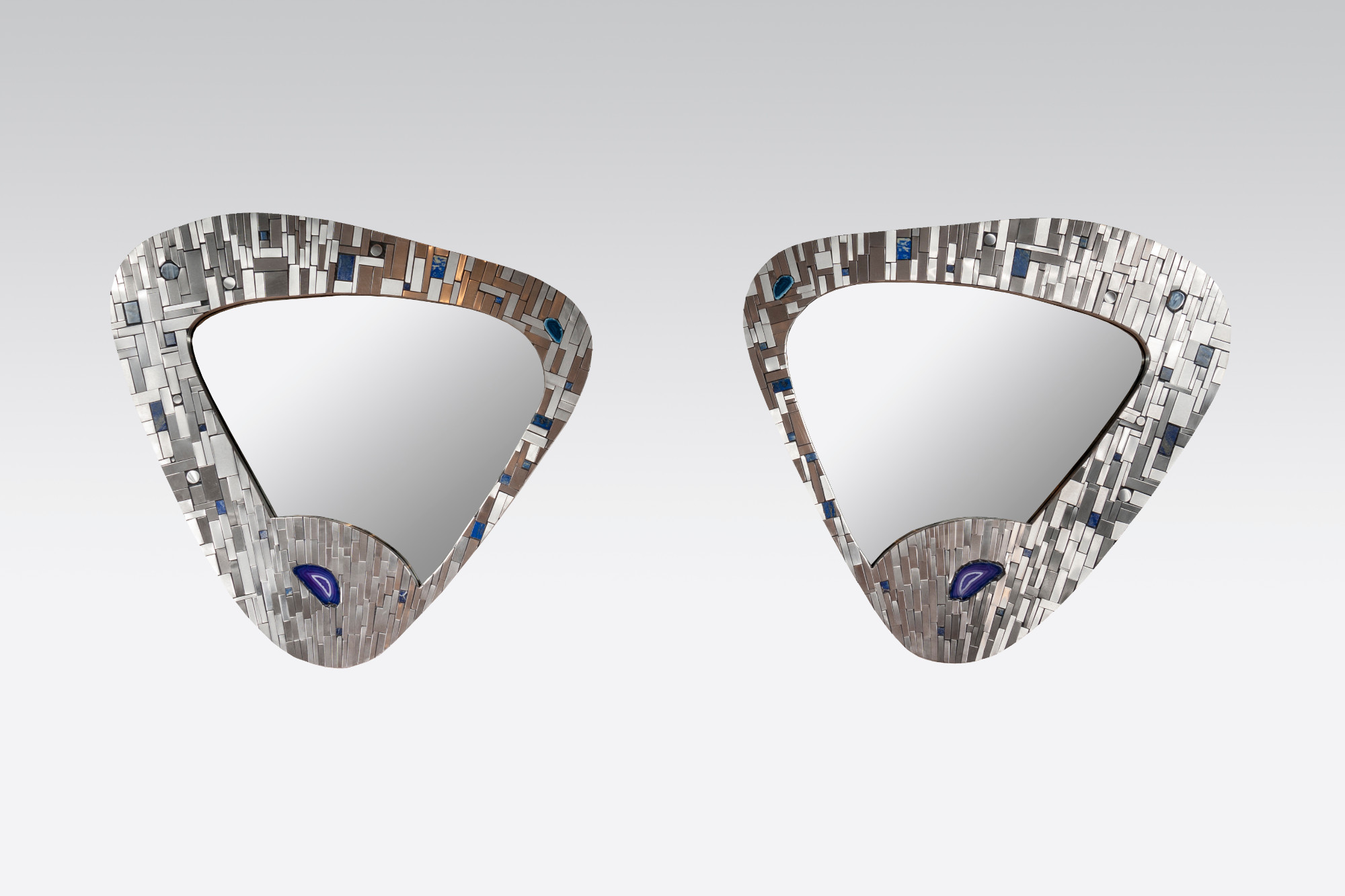 Created to measure by Stan Usel, this original pair of mirors in stainless steel are inserted with original lapis lazuli and agate stones. When put together within your interior decoration these mirors reflect a sense and deepness and luminisity. Exceptional craftsmanship with the art of tailor made furniture. This original and unique piece is signed by the artist and comes with a certificat of authenticity.All pieces can be custom-made to order. Proudly Belgian.