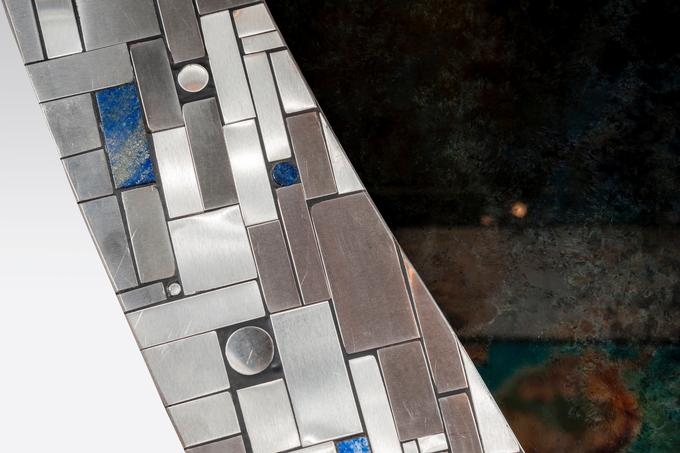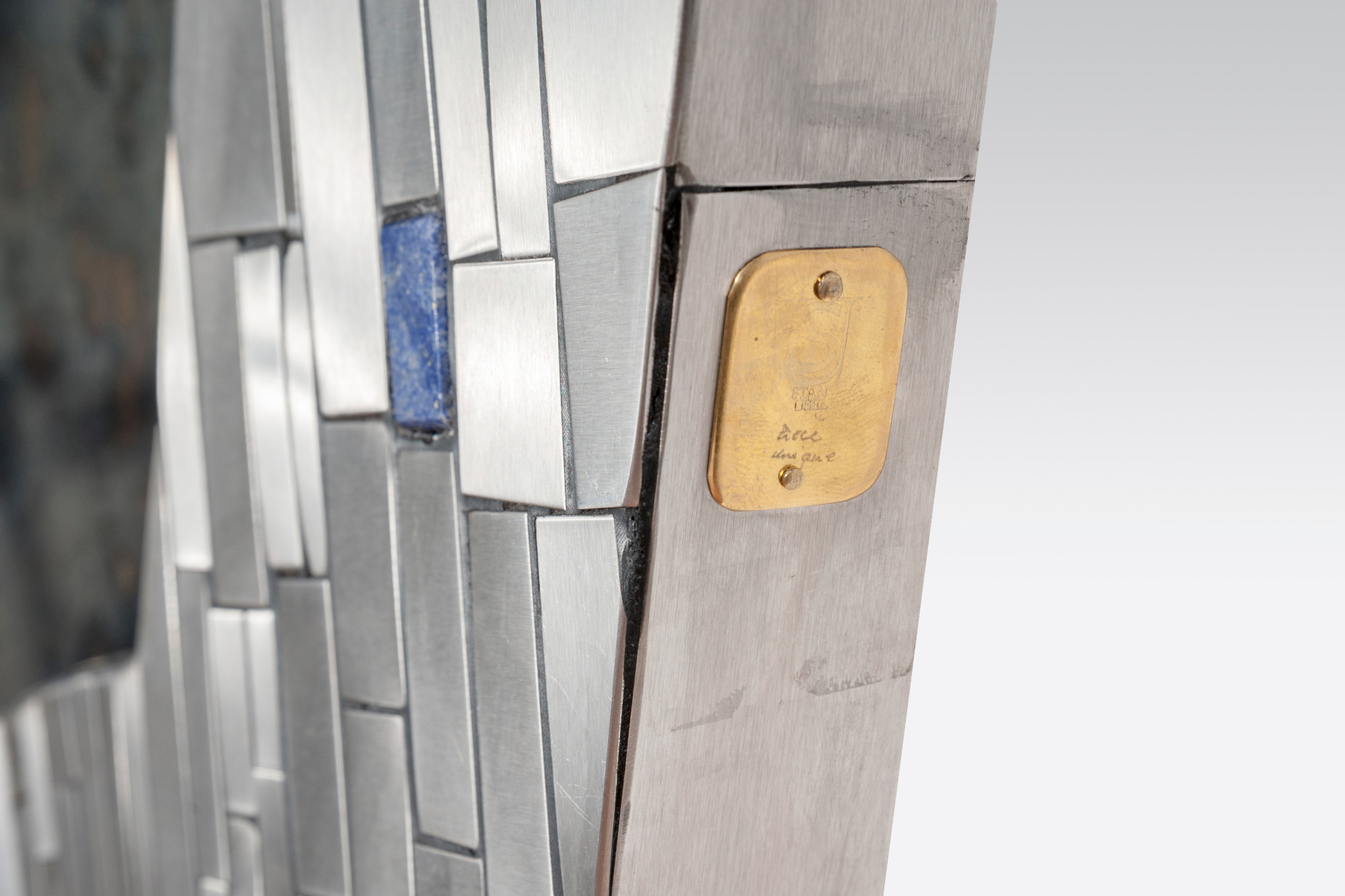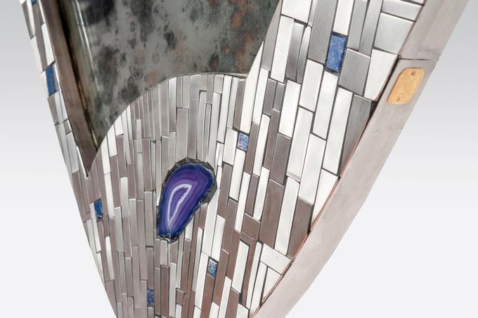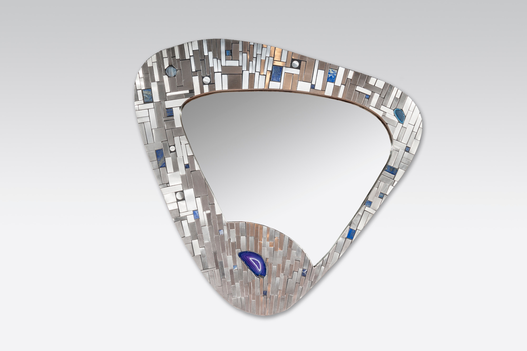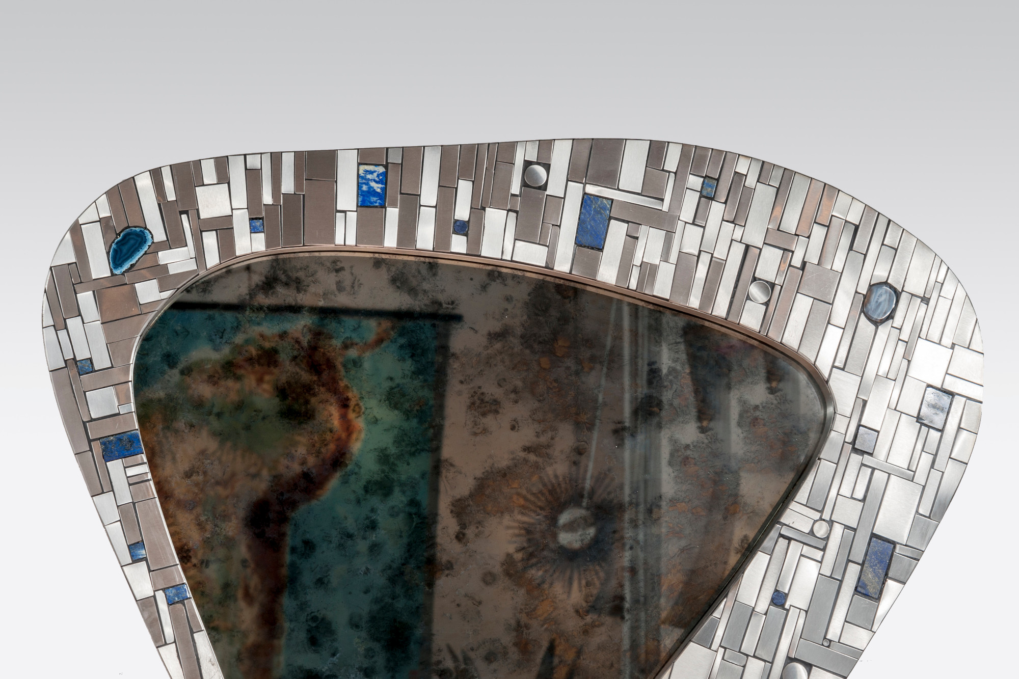 Created to measure by Stan Usel, this original pair of mirors in stainless steel are inserted with original lapis lazuli and agate stones. When put together within your interior decoration these mirors reflect a sense and deepness and luminisity. Exceptional craftsmanship with the art of tailor made furniture. This original and unique piece is signed by the artist and comes with a certificat of authenticity.All pieces can be custom-made to order. Proudly Belgian.