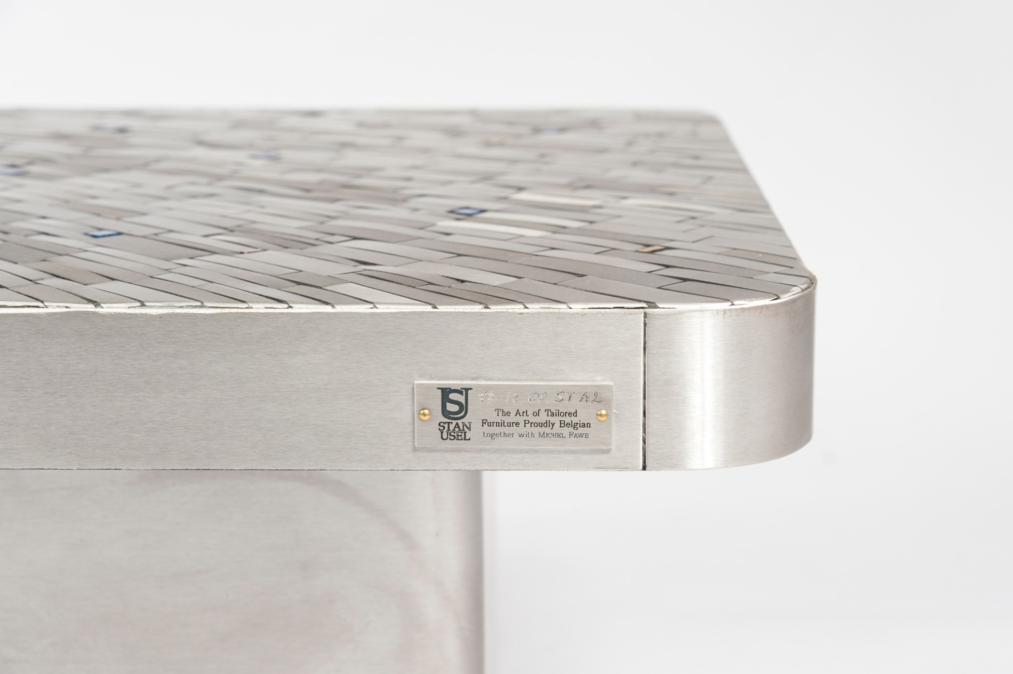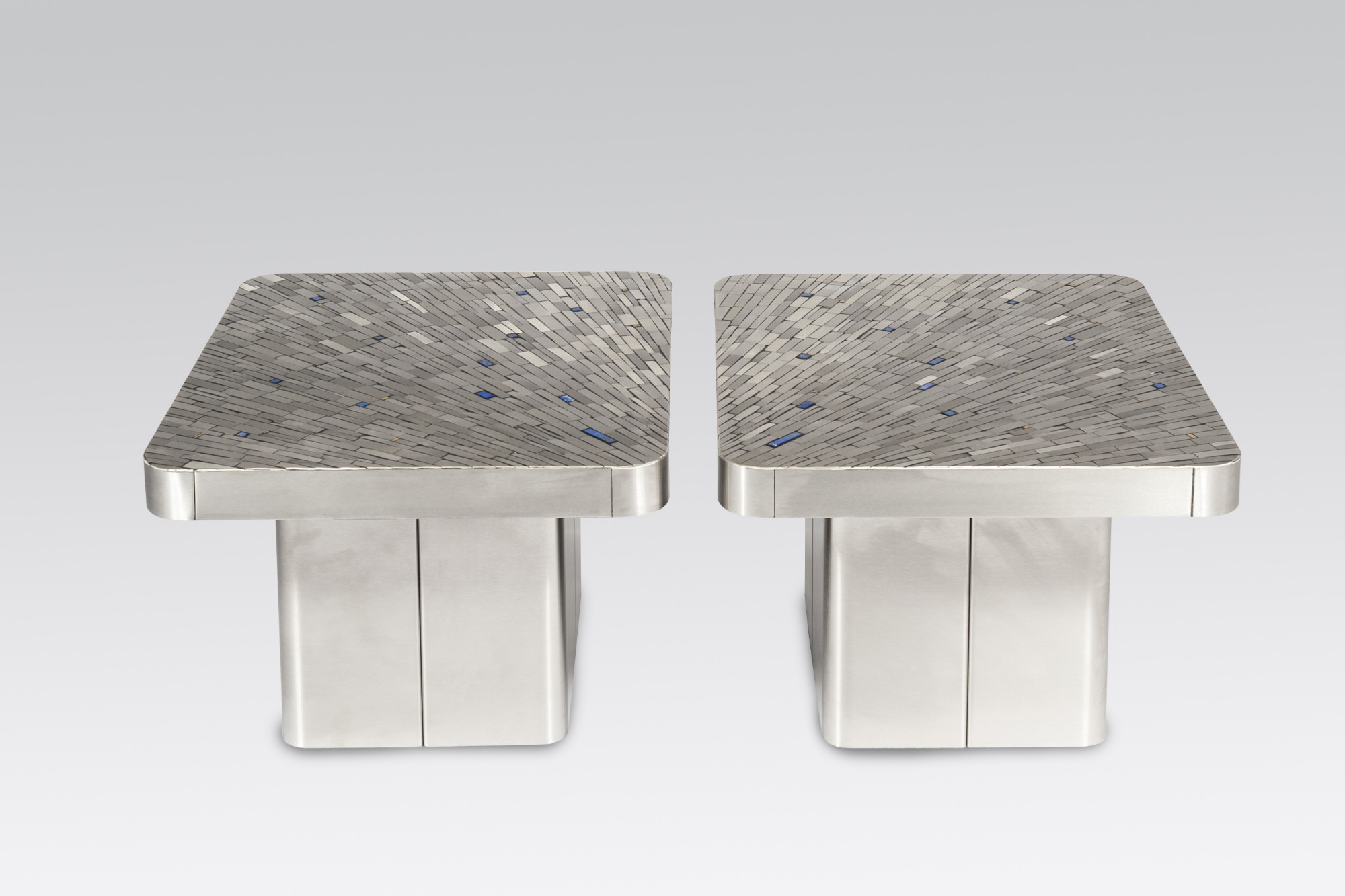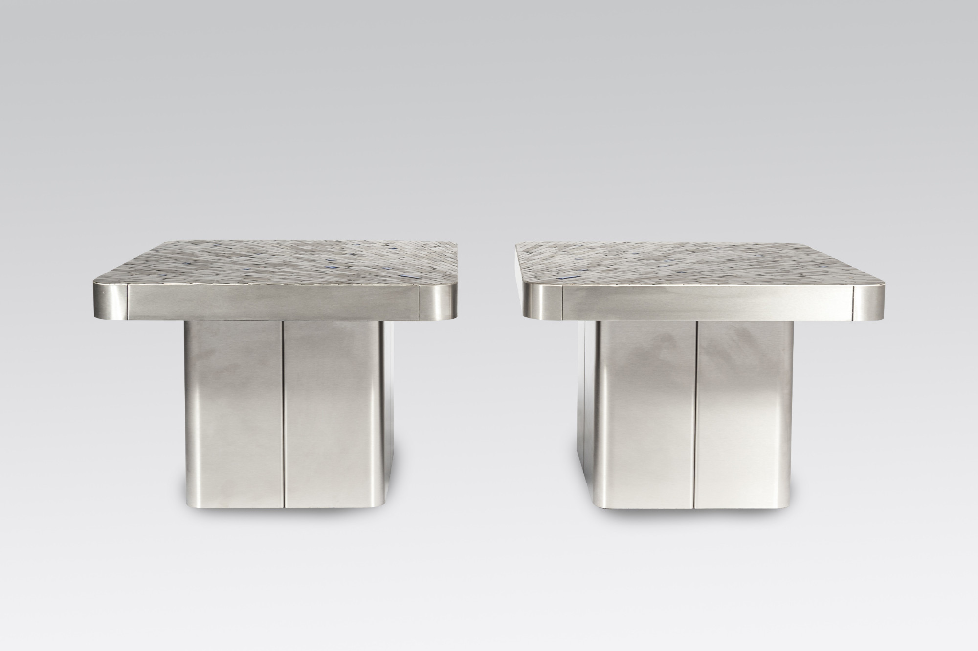 Created to measure by Stan Usel, this pair of side table in mosaic stainless steel and la pis lasuli gemstone. Do not hesitate to ask us the different models, already executed. Form Exceptional craftsmanship with the art of tailor made furniture. This original and unique pieces are signed by the artist and comes with the certificate of authenticity.All pieces can be custom-made to order. Proudly Belgian.