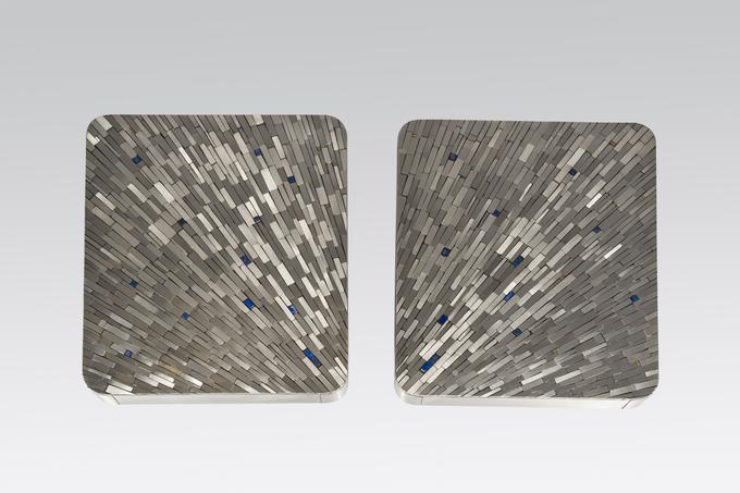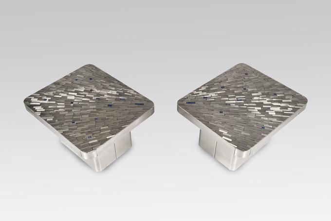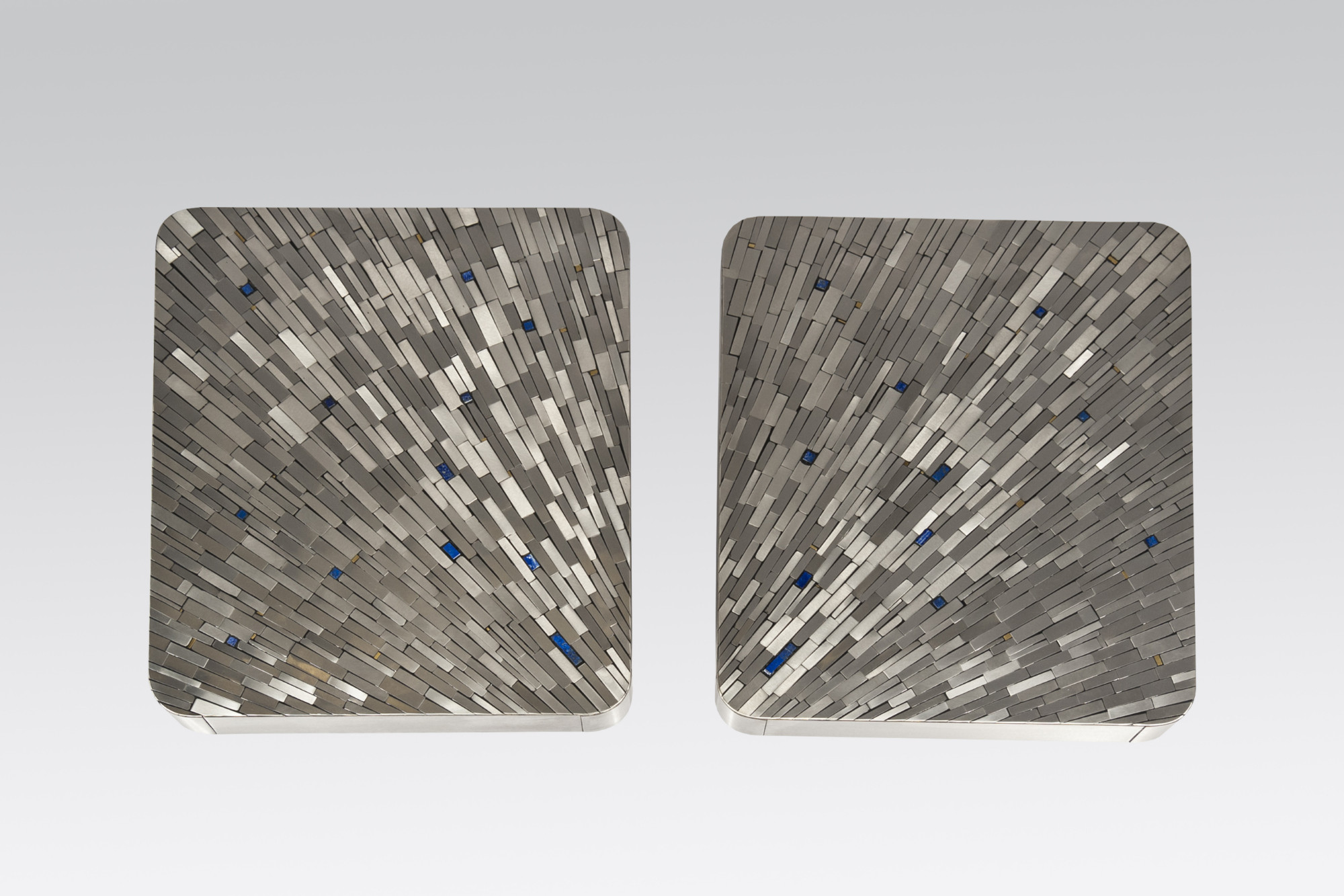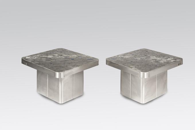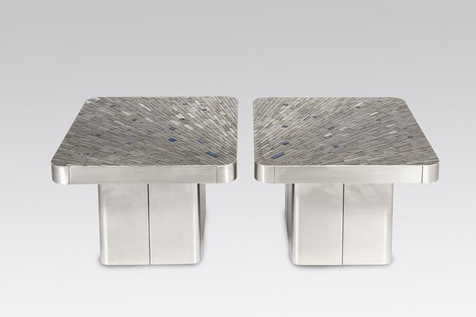 Pair of side table mosaic stainless steel and lapis lasuli by Stan Usel